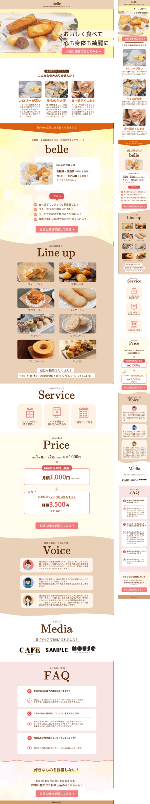 オリジナルのお菓子のサブスクサービスを考案し、そのLPを作成しました。 優しい配色を用いることでビジュアルからも”やさしい”ということが伝わるようにし、内容もお客様が知りたい内容を簡潔にし、パートごとに見やすくなるよう工夫いたしました。
